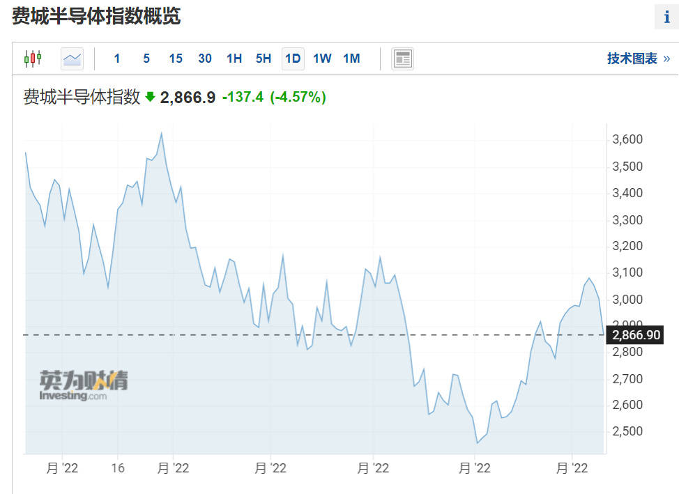 值得注意的是,周二费城半导体指数收跌4.57%,芯片类股中,拉姆研究跌7.88%,迈威尔科技跌7.79%,应用材料、科磊、Azenta、AMKR也至多跌7.58%,Wolfspeed、Teradyne、Entegris、安森美、SLAB至多跌6.98%,格芯(GFS)收跌5.95%,STM和ASML跌超5.52%,英伟达跌3.97%,美光科技跌3.74%。