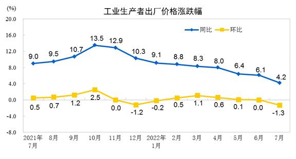 (原标题:2022年7月份工业生产者出厂价格同比上涨4.2% 环比下降1.3%)