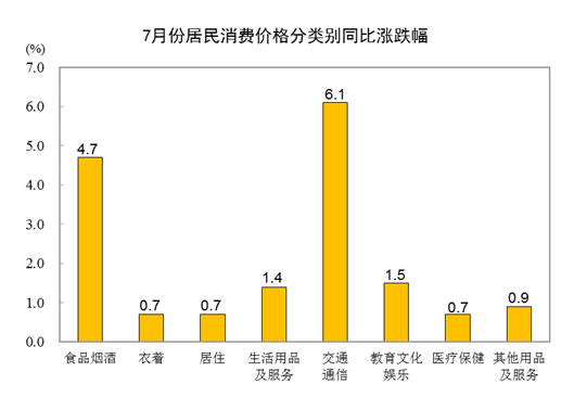 其他七大类价格同比均上涨。其中,交通通信、教育文化娱乐价格分别上涨6.1%和1.5%,生活用品及服务、其他用品及服务价格分别上涨1.4%和0.9%,衣着、居住、医疗保健价格均上涨0.7%。