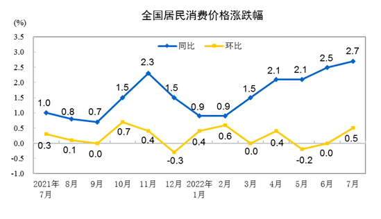 2022年7月份居民消费价格同比上涨2.7% 环比上涨0.5%
