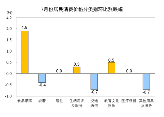 7月份,全国居民消费价格环比上涨0.5%。其中,城市上涨0.4%,农村上涨0.5%;食品价格上涨3.0%,非食品价格下降0.1%;消费品价格上涨0.6%,服务价格上涨0.3%。