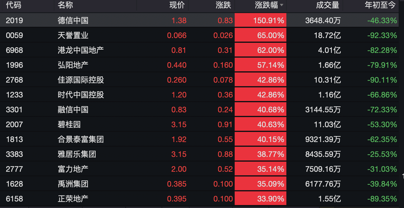 港股表现更加兴奋,内房股亦普遍高开, 恒生地产建筑业指数以7.97%的涨幅居于各指数之首,89只成分股无一下跌,更16只地产股涨幅超30%。其中,德信中国涨幅为最大,超150%,天誉置业、港龙中国涨幅超60%,碧桂园、合景泰富涨幅超40%,雅居乐集团、富力地产、正荣地产也分别录得超30%的涨幅。