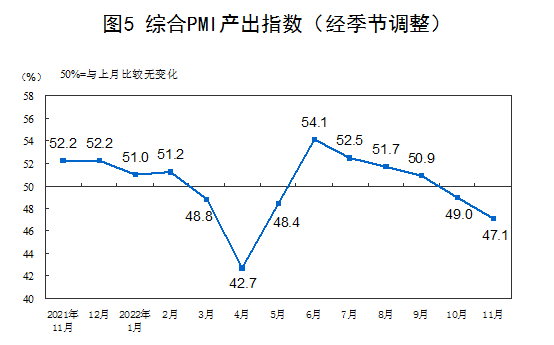 11月份,综合PMI产出指数为47.1%,比上月下降1.9个百分点,低于临界点,表明我国企业生产经营活动总体继续放缓。
