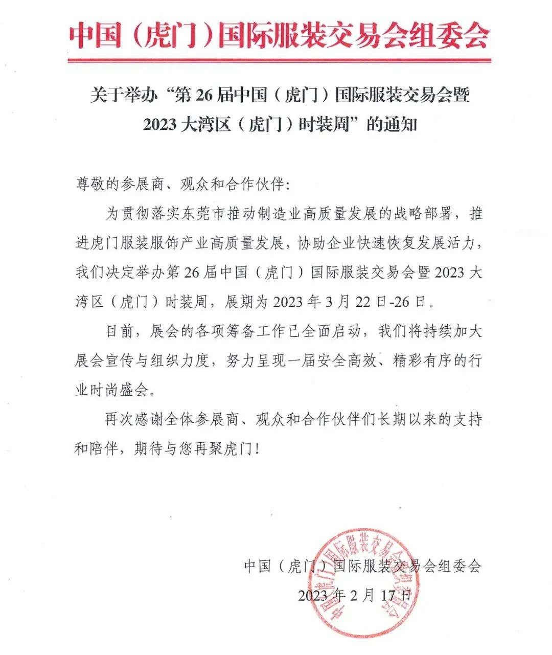 第26届中国(虎门)国际服装交易会暨2023大湾区(虎门)时装周,将于2023年3月22日-26日举办!(来源:虎门太平 )