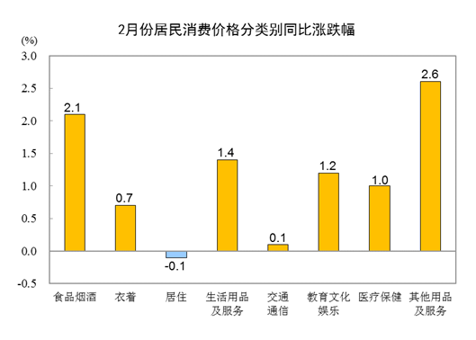 2月份,食品烟酒类价格同比上涨2.1%,影响CPI(居民消费价格指数)上涨约0.59个百分点。食品中,鲜果价格上涨8.5%,影响CPI上涨约0.18个百分点;蛋类价格上涨7.8%,影响CPI上涨约0.05个百分点;粮食价格上涨2.7%,影响CPI上涨约0.05个百分点;畜肉类价格上涨1.9%,影响CPI上涨约0.06个百分点,其中猪肉价格上涨3.9%,影响CPI上涨约0.05个百分点;水产品价格下降1.5%,影响CPI下降约0.03个百分点。