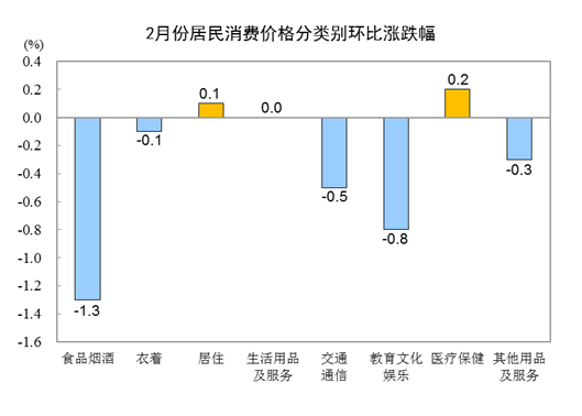 2月份,全国居民消费价格环比下降0.5%。其中,城市下降0.5%,农村下降0.5%;食品价格下降2.0%,非食品价格下降0.2%;消费品价格下降0.6%,服务价格下降0.4%。