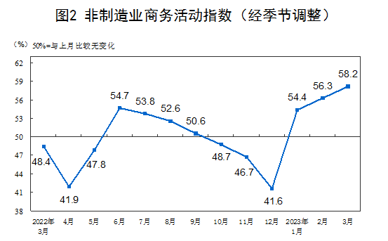3月份,非制造业商务活动指数为58.2%,比上月上升1.9个百分点,高于临界点,非制造业恢复发展步伐加快。