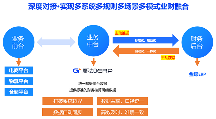 积加ERP是国内主流的跨境ERP系统,与金蝶ERP集成财务精益化解决方案,以财务合规为原则(专业),以降本增效为目的(高效),提高跨境电商财务管理水平,提升绩效考核的合理性与及时性。积加ERP打破系统边界,统一解析前台数据,提供标准的财务核算明细数据,并打通了业务、财务之间的数据流,让业务、财务流程无缝对接,提高财务工作效率,提供数据查询接口,可以对接所有ERP,实现业财一体化。