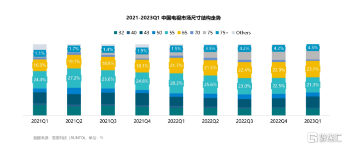 这背后的原因在于居民对于大尺寸电视的需求正持续增长。根据洛图科技(RUNTO)数据,一季度中国电视市场65吋已经超越 55吋,成为第一大尺寸,到2023年6月,中国整机市场平均尺寸已突破60吋。未来随着电视逐渐大屏化,上游面板需求面积将继续攀升,为电视面板龙头带来持续的增长动能。