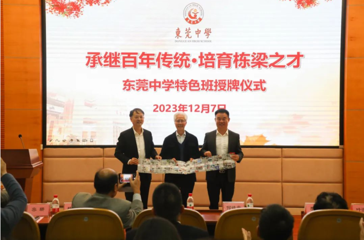 12月7日,东莞中学特色班——“镜堂班”“容庚班”授牌仪式举行。随着何镜堂院士和容庚先生亲属将“镜堂班”“容庚班”授予东莞中学校长王健,标志着这所以东莞城市命名的百年名校在新时代为探索培育拔尖创新人才实迈出了又一坚实步伐。