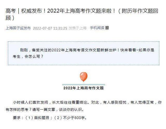 中新网7月7日电 据上海市教育考试院官方微信消息,上海市教育考试院7日发布2022年上海高考作文题: