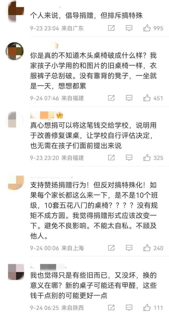 也有网友担心,曾先生给一个班换了新桌椅,会不会引发其他班学生们的羡慕甚至攀比之心,或者给其他班的家长增添压力?曾先生表示,他的出发点是为自己女儿和她班上同学好,没想太多其他的事。