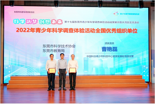 活动中,广东省科协事业发展中心项目主管彭柏洪为第十七届广东省青少年科学调查体验活动优秀组织单位颁发牌匾;莞市教育局主任督学罗桂森、东莞市科协秘书长吴石宝为2022年青少年科学调查体验活动全国优秀实施学校颁发获奖证书;中国科协青少年科技中心资源发展处项目主管曹艳磊为2022年青少年科学调查体验活动全国优秀组织单位颁发牌匾。东莞市优秀教师代表、优秀学校代表、镇街代表及外市代表还分享了科技教育经验,助力大湾区科学教育发展。