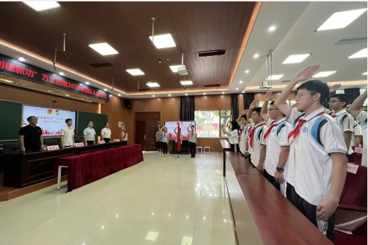 青春是炙热的五月,青年是五月的花海。为进一步规范和加强团队衔接,切实增强少先队员、共青团员的光荣感和使命感,5月6日,万江团工委联合万江街道教管中心、少工委举行“走在前列建新功”万江街道2023年离队入团仪式,约80名学生代表参加活动。