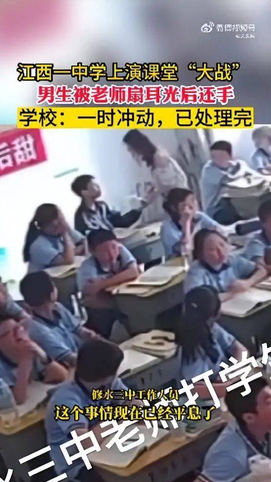 据澎湃新闻,6月14日上午,修水县教育体育局办公室一名工作人员告诉记者,事发于修水县第三中学的初一课堂上,涉事老师任班主任, 上课时,涉事学生做了一些“和学习无关的事”,老师上前制止,但学生不服管教,老师比较生气,动手打了学生,遭到学生还手。