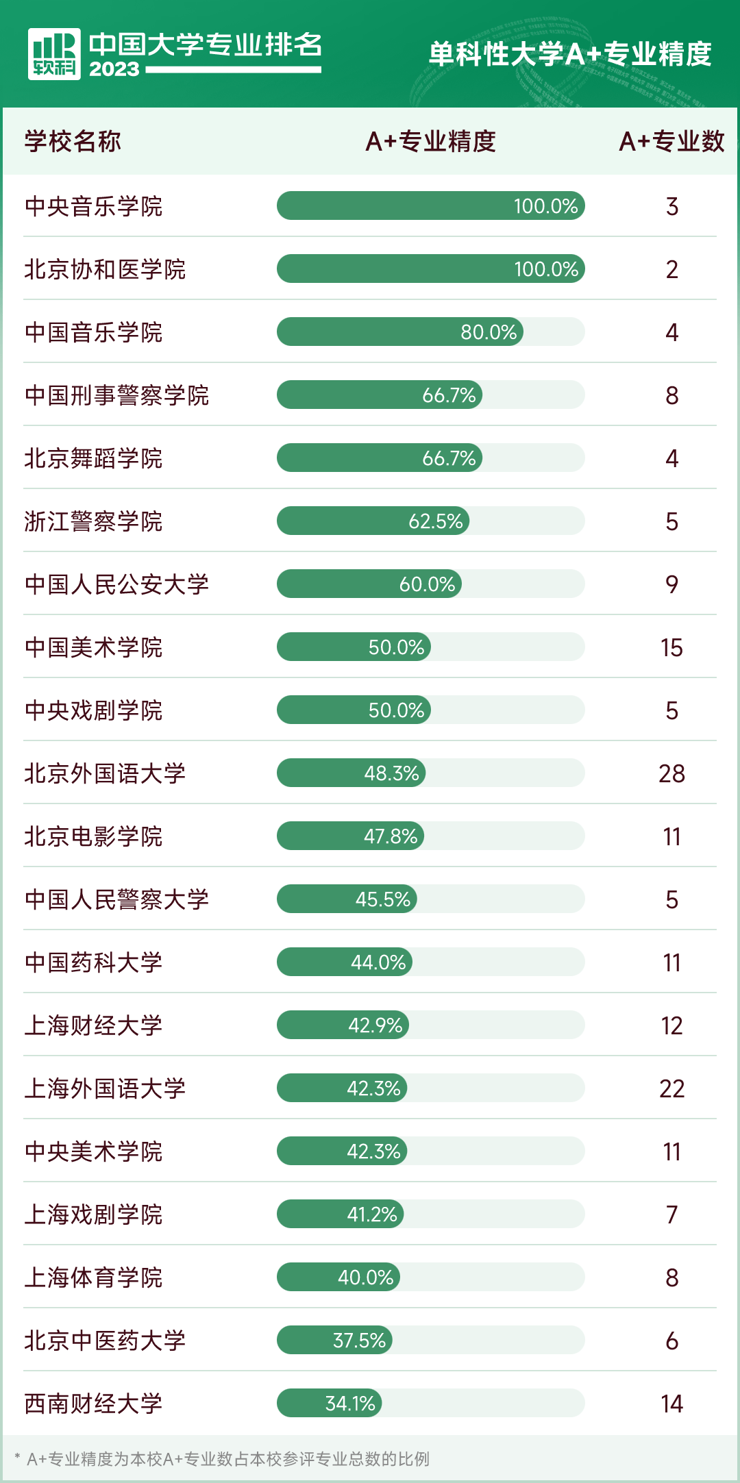 2023软科中国大学专业排名中,单科性大学A+专业精度表现突出,排名前列的依次是中央音乐学院(100%)、北京协和医学院(100%)、中国音乐学院(80.0%)、中国刑事警察学院(66.7%)、北京舞蹈学院(66.7%)、浙江警察学院(62.5%)、中国人民公安大学(60.0%)。其中,北京协和医学院和中央音乐学院的A+专业精度达到100%,体现了两校专业建设的极高水准。