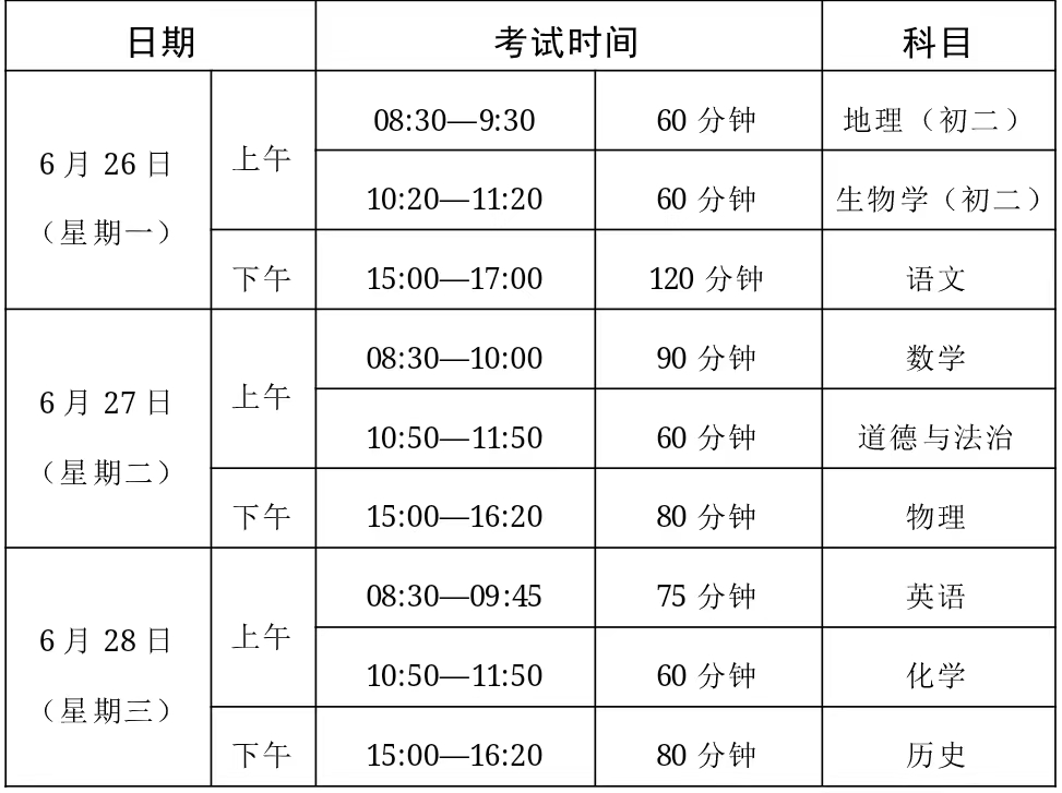 6月26日上午,组织初二年级中考,包括地理和生物共2个科目考试;6月26日下午至28日下午,组织初三年级中考,包括语文、数学、道德与法治、物理、英语、化学和历史共7个科目。