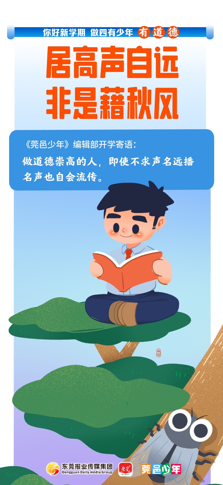 “居高声自远,非是藉秋风”,蝉声远传,并非借助秋风之力,而是居高临下,高屋建瓴,自然而已。国无德不兴,人无德不立,道德的力量春风化雨,推动着越来越多的人见贤思齐、共同支撑着道德的蓝天,把我们的精神家园装点得绚丽多姿。同学们,做一个“孝、忠、信”的人,是我们立世的根本。在新的学期,要在日常生活中注意礼节礼貌,不乱扔垃圾、上课认真听讲、不迟到、课外积极参与志愿者活动,加强思想道德修养,注重道德实践和人格魅力养成,做品行高洁之人。