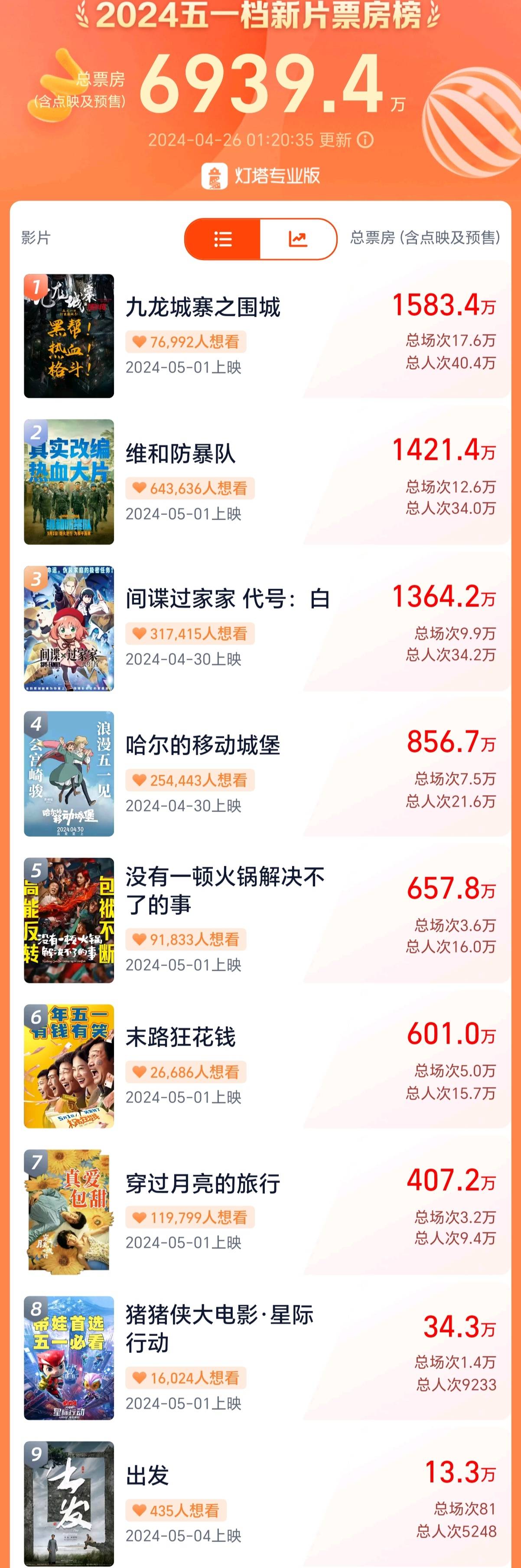 两部日本动画《间谍过家家 代号:白》和《哈尔的移动城堡》表现也相对较好,票房分别排在第三、第四。其中,《间谍过家家 代号:白》即将超过《维和防暴队》。