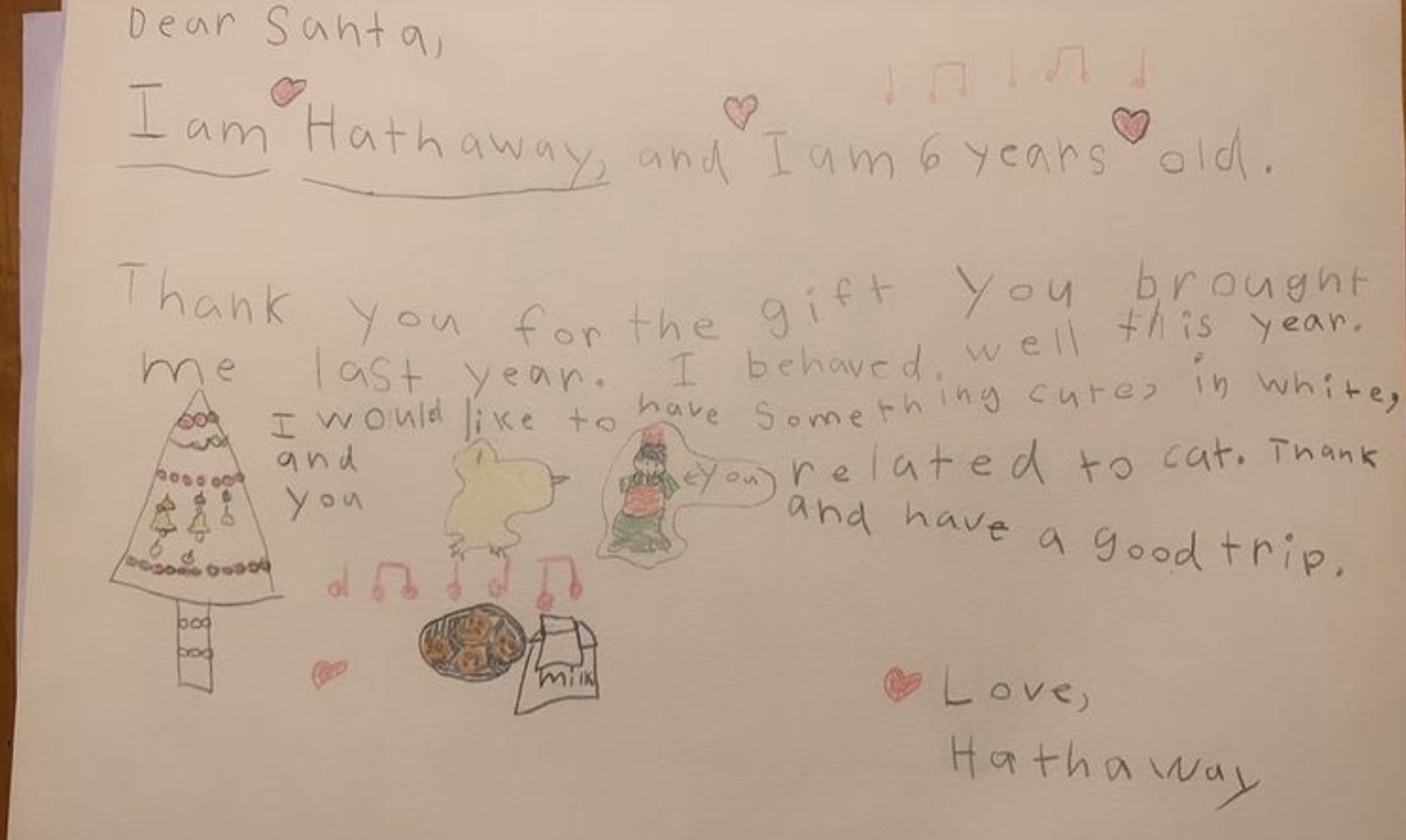 亲笔信内容写到:亲爱的圣诞老人,我是海瑟薇,今年6岁,谢谢您去年送给我的礼物。我今年也表现得特别好,我想要白色可爱的东西,而且要和猫有关。谢谢,祝您有愉快的旅途!