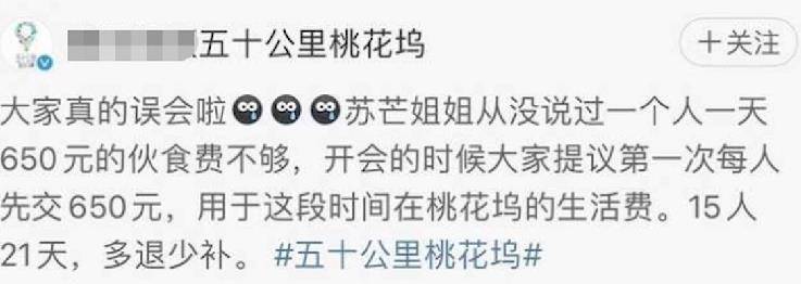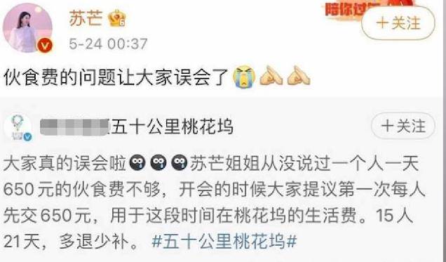 之后也许是见这件事越闹越大,节目组才不得已出面澄清,称苏芒的意思是15人吃21天,所以650元才会不够。