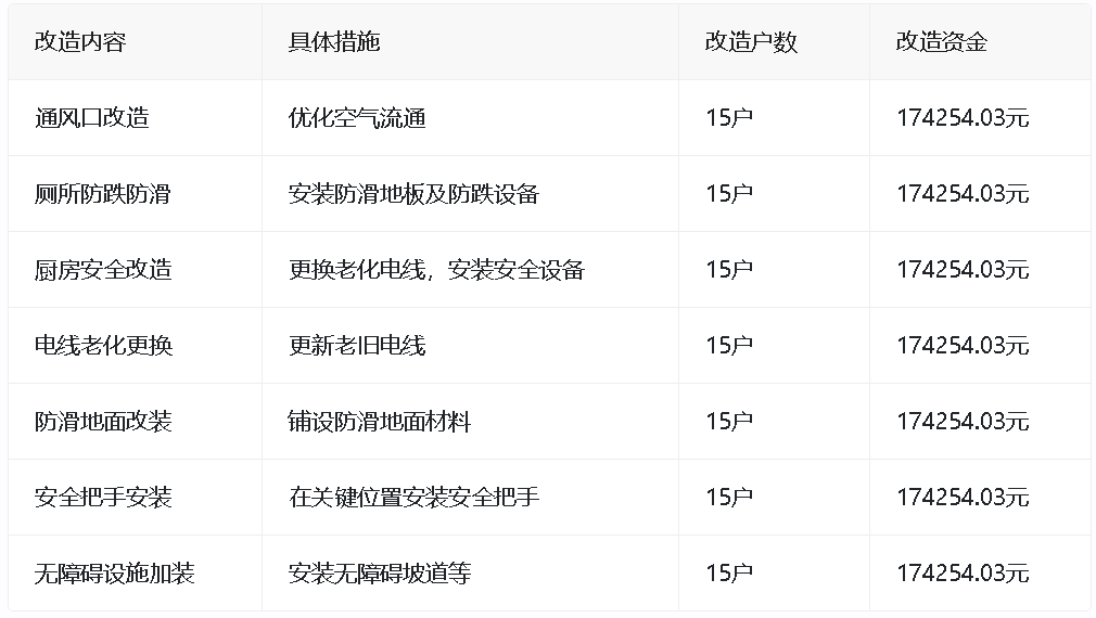 - 改造内容包括通风口改造、厕所防跌防滑设置、厨房安全改造、电线老化更换、防滑地面改装、安全把手安装、无障碍设施加装等。