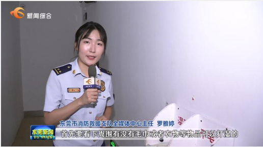 东莞市消防救援支队全媒体中心主任罗雅婷:“当我们选择逃生之后,首先要看下周围有没有毛巾或者衣物等可以打湿,捂住口鼻隔绝部分的烟气。如果没有,可以用手肘挡住口鼻,阻隔一些烟气。”