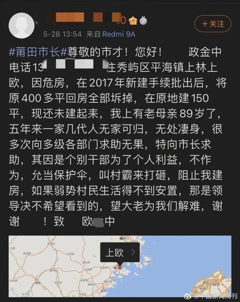 @中国新闻周刊 援引欧某同村的知情人士说法称,2017年,欧某向当地政府申请了危房翻盖,房屋新建手续批出后,欧某便将原有400平米的房屋拆除,欲在原有土地上建盖新房。而死者为欧某邻居,曾多次联合附近居民阻挠欧某建盖新房,导致欧某一家无处可归,在临时搭建的雨棚居住六年。案发前,欧某居住的雨棚因台风倒塌,雨棚残片掉入死者家中,双方因此发生争执。