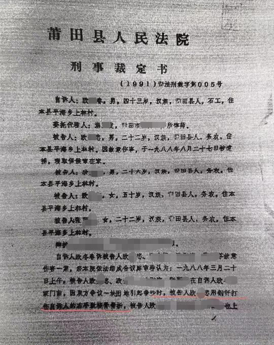 九派新闻获得一份1991年莆田市人民法院的刑事裁定书截图,其中写道,被告人欧某忠,男,二十二岁,汉族,务农,住本县平海乡上林村。因故意伤害,于一九八八年八月二十七日被逮捕,现取保候审在家。