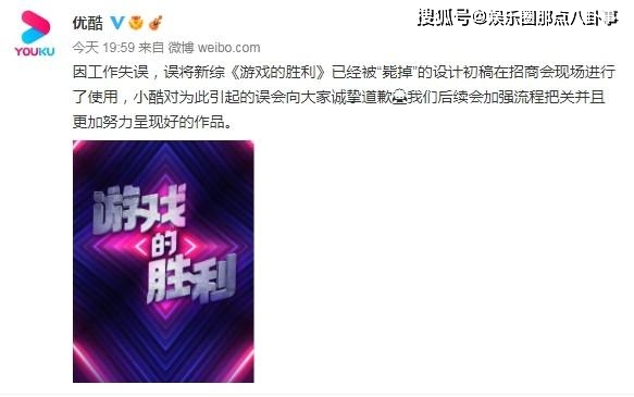 优酷通过微博回应此事称,因工作失误,误将新综《游戏的胜利》已经被“毙掉”的设计初稿在招商会现场进行了使用。优酷对为此引起的误会向大家诚挚道歉,后续会加强流程把关并且更加努力呈现好的作品。