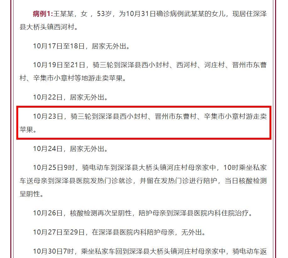 据石家庄市卫健委,53岁的王某某现住深泽县大桥头镇西河村,10月23日,她骑三轮到深泽县西小封村、晋州市东曹村、辛集市小章村游走卖苹果。