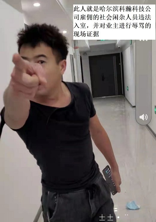 哈尔滨科瀚科技有限公司,注册地哈尔滨松北区松浦大道2288号,老板是白国峰,施工负责人马志玮,记者在松北区坤腾·理想城楼盘发现,该楼盘的C栋为精装修房,在业主已经进户后,门锁一律都由哈尔滨科瀚科技有限公司负责施工,该公司在施工过程中出现各种违法侵权行为,施工人员一律是社会闲杂人员,不仅野蛮施工,而且非法侵犯业主切身利益,未经户主同意,私自破坏业主家的门锁,并违法进入业主家中,当业主提出制止时,闲杂人员又对业主进行谩骂,当业主对施工人员的违法行为进行驱离时,该公司的施工人员还对业主进行殴打,这件事情就发生在2021年11月4日的上午,业主当场进行了拍照录像,记者经过多方了解,几乎大多数业主都反映哈尔滨科瀚科技有限公司在施工过程中严重违法,事后记者到物业公司核实情况,要求查看哈尔滨科瀚科技公司的施工备案资料,却没有看到该公司的任何施工备案手续,尤其是现场施工人员均来自于社会闲杂人员,不仅素质非常低下,而且施工现场的管理混乱不堪,严重破坏了业主的安全居住环境。