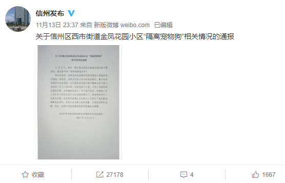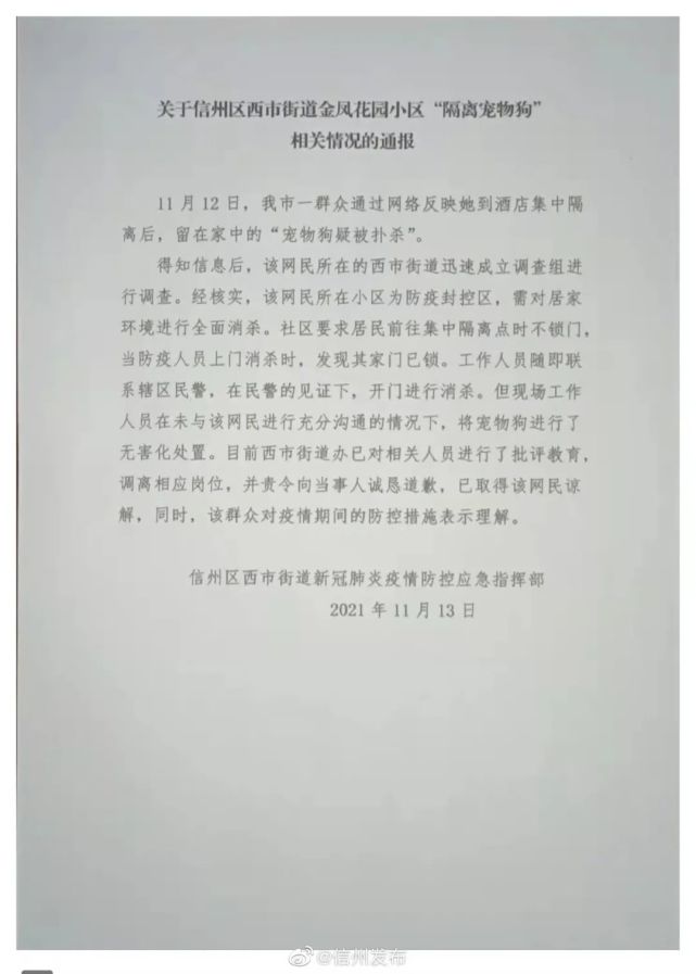 11月13日23时37分,信州发布发表《关于信州区西市街道金凤花园小区‘隔离宠物狗’相关情况的通报》称:“现场工作人员在未与该网民进行充分沟通的情况下,将宠物狗进行了无害化处置。”