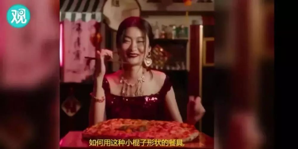 模特用奇怪的姿势用筷子吃Pizza等