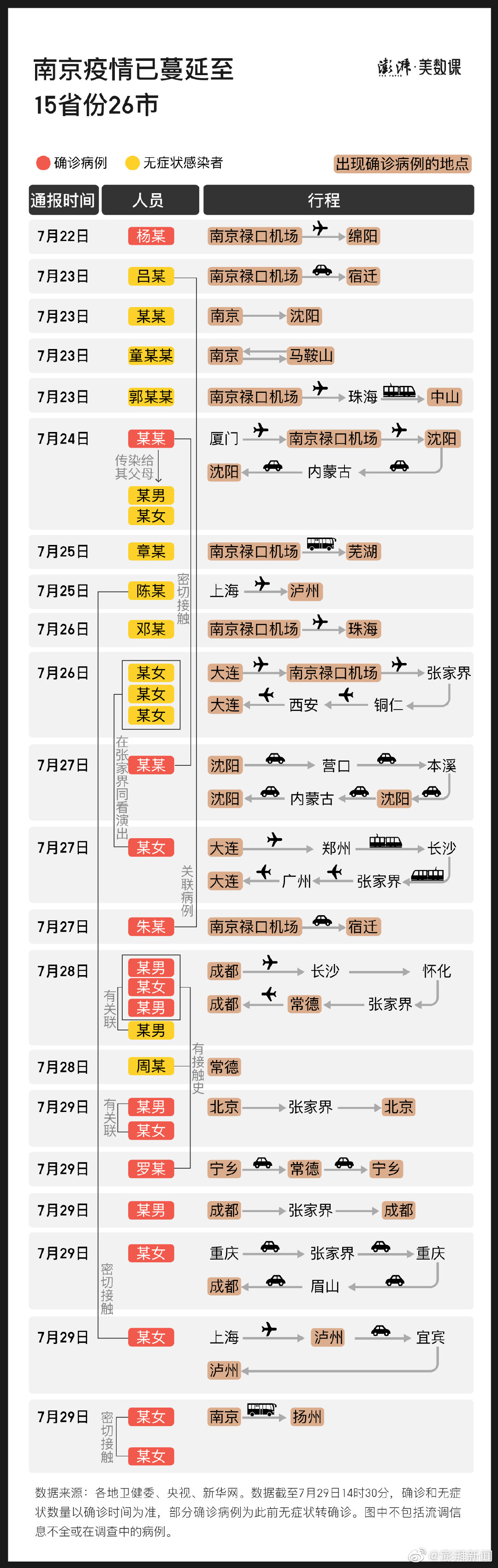 7月20日以来,南京市累计本土病例已上升至171例,其中重型7例。澎湃新闻记者在梳理各地卫健委通报的流调信息后发现:在9天时间里,南京本地疫情已蔓延至15省份26市。7月29日的通报中,北京和四川各有2例新增本地确诊病例都曾到张家界游玩。此前,大连1例确诊病例曾与南京感染者在张家界同看演出。观看这场演出的2000多名观众经评估后均属高风险人群。由于南京本地疫情的传播链条已开始蔓延,未来能否在短时间内发现所有感染者,已成为控制疫情发展的最大考验。