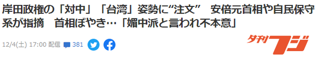 《夕刊富士》:前首相安倍和自民党保守派给岸田政权的“对华”“台湾”态度提要求, 岸田发牢骚“我本不希望被称为媚中派”