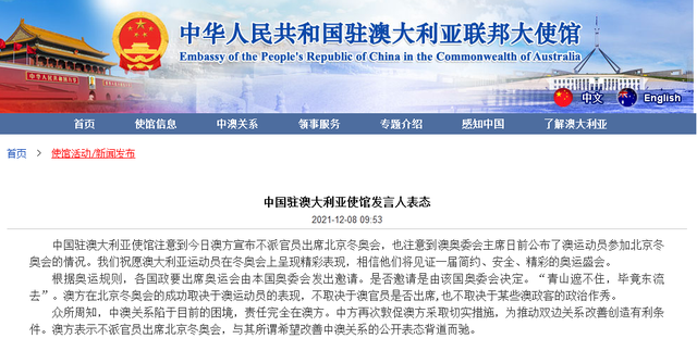 原标题:澳大利亚宣布不派官员出席北京冬奥会,中国驻澳使馆刚刚回应!