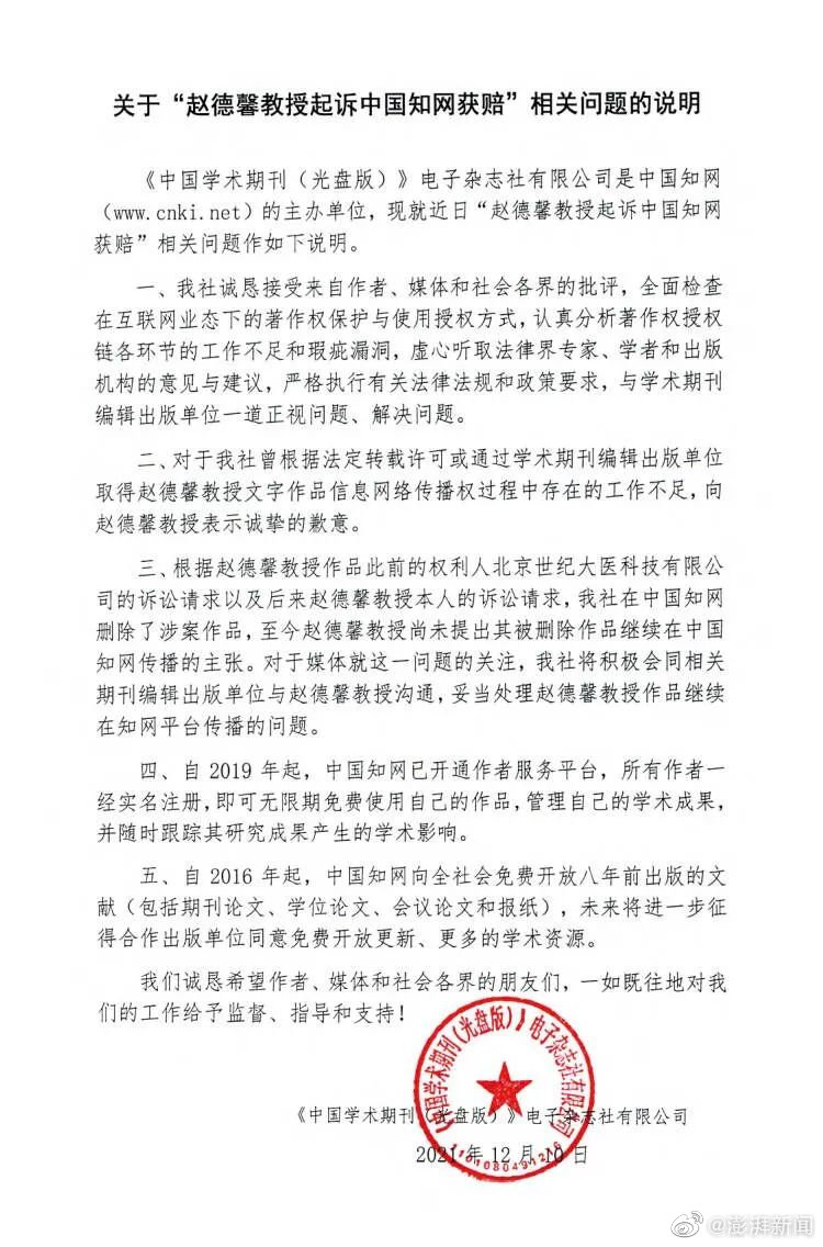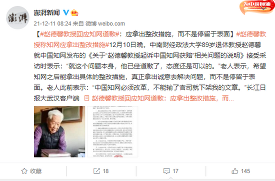 12月10日晚,中南财经政法大学89岁退休教授赵德馨就中国知网发布的《关于“赵德馨教授起诉中国知网获赔”相关问题的说明》接受采访时表示:“就这个问题本身,他已经道歉了,态度还是可以的。”老人表示,希望知网之后能拿出具体的整改措施,真正拿出诚意去解决问题,而不是停留于表面。老人此前表示:“中国知网必须改革,不能输了官司就下架我的文章。”