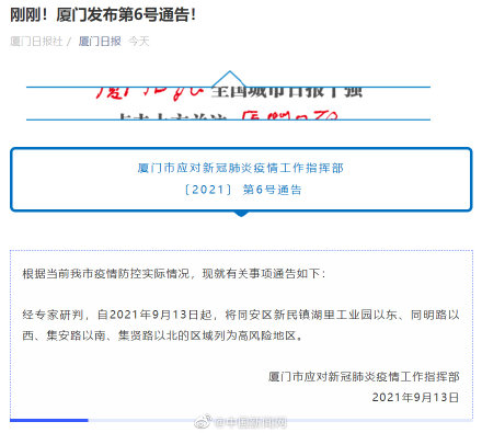 厦门市应对新冠肺炎疫情工作指挥部13日发通告称:经专家研判,自2021年9月13日起,将同安区新民镇湖里工业园以东、同明路以西、集安路以南、集贤路以北的区域列为高风险地区。 (厦门日报)
