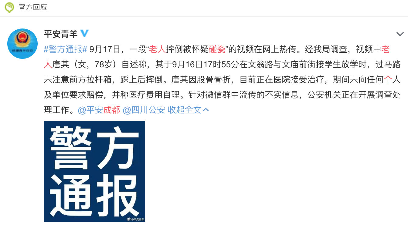 #官方回应成都老太碰瓷学生#【[话筒]假的!警方通报#成都老人碰瓷小学生是个假新闻#】@平安青羊 发布通报:9月17日,一段“老人摔倒被怀疑碰瓷”的视频在网上热传。经我局调查,视频中老人唐某(女,78岁)自述称,其于9月16日17时55分在文翁路与文庙前街接学生放学时,过马路未注意前方拉杆箱,踩上后摔倒。唐某因股骨骨折,目前正在医院接受治疗,期间未向任何个人及单位要求赔偿,并称医疗费用自理。针对微信群中流传的不实信息,公安机关正在开展调查处理工作。