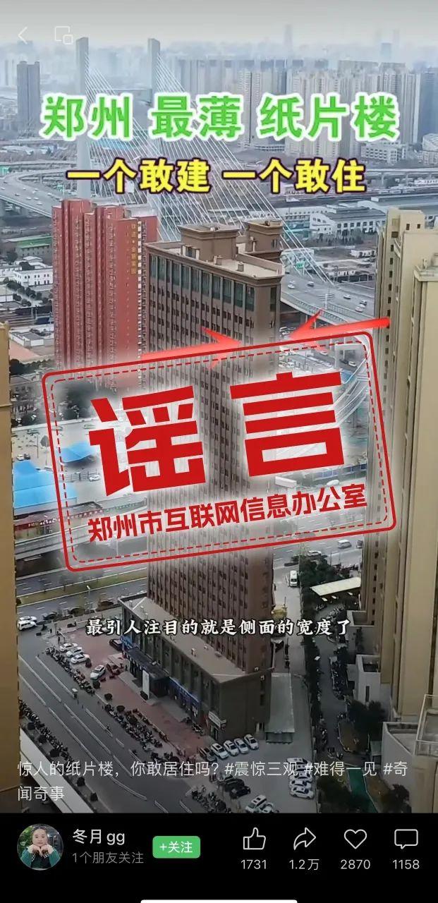 3月2日,微信视频号“冬月gg”发布视频称“郑州最薄纸片楼,一个敢建,一个敢住,远远望去有一种摇摇欲坠的感觉”。经查证,该大厦为“L”型建筑,所谓“最薄纸片楼”的说法不实。针对该楼,2016年有媒体曾经报道澄清,“据了解,‘纸片楼’薄如纸片的立面只是视线错觉,这座楼实际是带有三角的多边形建筑。据业内专家介绍,有些开发商在造楼时会将地界利用到最大限度,贴着马路边建楼,也叫做贴界,也就造就了这种‘纸片楼’,楼体的安全还是有保障的”。