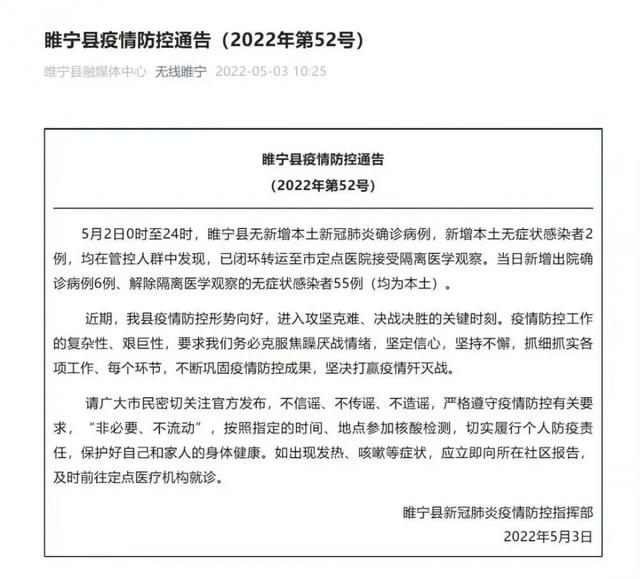 据睢宁县新冠肺炎疫情防控指挥部5月3日发布通告,5月2日0时至24时,睢宁县无新增本土新冠肺炎确诊病例,新增本土无症状感染者2例,均在管控人群中发现,已闭环转运至市定点医院接受隔离医学观察。目前,该县疫情防控形势向好。
