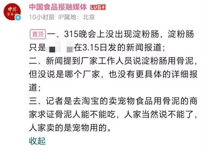 引起这么大风波的,其实是 315 当天,某网站发布的一篇文章,主要是揭秘淀粉肠的原材料。