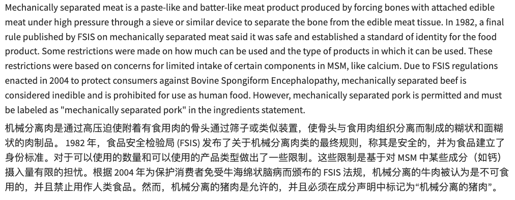 早在 1982 年,美国食品安全检验局( FSIS ) 最终认为机械分离肉是符合食物安全标准的,允许用在一些特定的食物里。