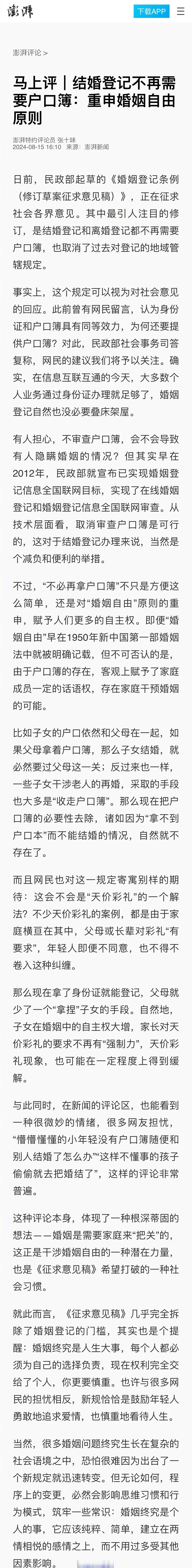 【媒体评:结婚不要户口本或缓解天价彩礼现象】15日,“结婚登记不再需要户口簿”登上热搜引发热议。不可否认的是,由于户口簿的存在,客观上赋予了家庭成员一定的话语权,存在家庭干预婚姻的可能。而且网民也对这一规定寄寓别样的期待:这会不会是“天价彩礼”的一个解法?不少天价彩礼的案例,都是由于家庭横亘在其中,父母或长辈对彩礼“有要求”。那么现在拿了身份证就能登记,父母就少了一个“拿捏”子女的手段。自然地,子女在婚姻中的自主权大增,家长对天价彩礼的要求不再有“强制力”,天价彩礼现象,也可能在一定程度上得到缓解。#婚姻登记取消户口簿彰显婚姻自由#
