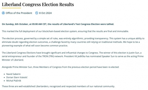 利伯兰官方声明称,本次选举于 10 月 6 日中欧时间凌晨 5 点完成计票,标志着该国基于区块链的选举系统首次全面部署。选举过程采用简单规则集,完全算法化,旨在提供透明度并消除对选举结果的质疑。