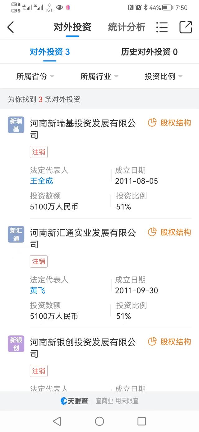 在对外投资方面,河南新财富集团是三家企业的大股东,持股均为51%。这三家企业是:河南新瑞基投资发展公司、河南新汇通实业发展公司、河南新银创投资发展公司。