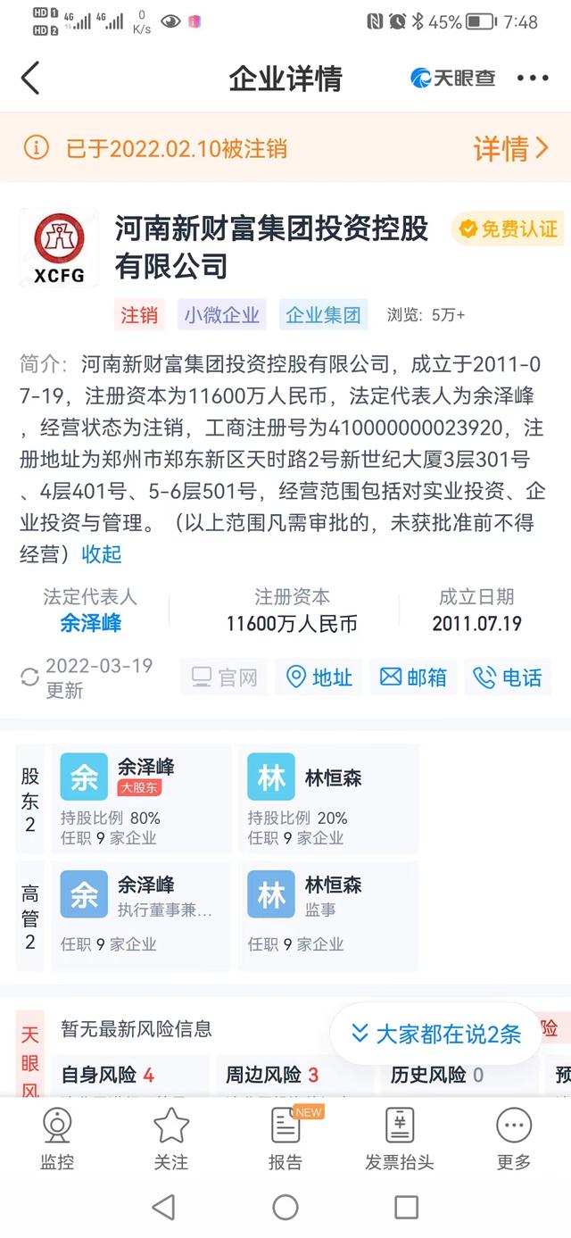 河南新财富集团的工商注册信息。图片来源于天眼查。工商信息显示,河南新财富集团成立于2011年,注册地址为郑州市郑东新区,注册资本11600万元,经营范围是“对实业投资、企业投资与管理”。该公司股东有两人,分别是持股80%的余泽峰、持股20%的林恒森。据财新报道,河南新财富集团与许昌农商行发起设立的多家村镇银行都有关联,或作为“隐形”股东间接持股;有河南银行业人士透露,开封新东方村镇银行原来的实控人也是河南新财富集团,后来新财富集团退出,由河南新郑农商行控股30%;河南新财富集团背后的实际控制人,或为商人吕奕。