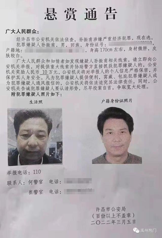 3月5日许昌市公安局发布的《悬赏通告》显示,“经许昌市公安机关依法侦查,孙振甫涉嫌严重经济犯罪,现在逃。”通告称,对提供重大线索并协助警方抓获犯罪嫌疑人的,公安机关奖励人民币10万元。
