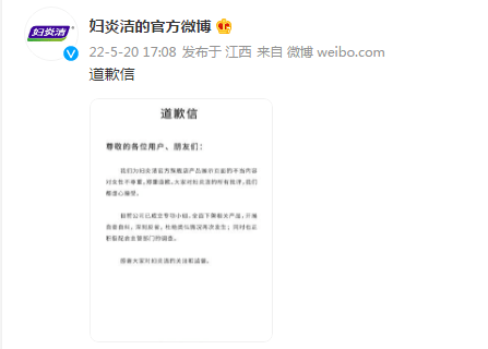 刚刚,妇炎洁的官方微博发布“道歉信”,全文如下: